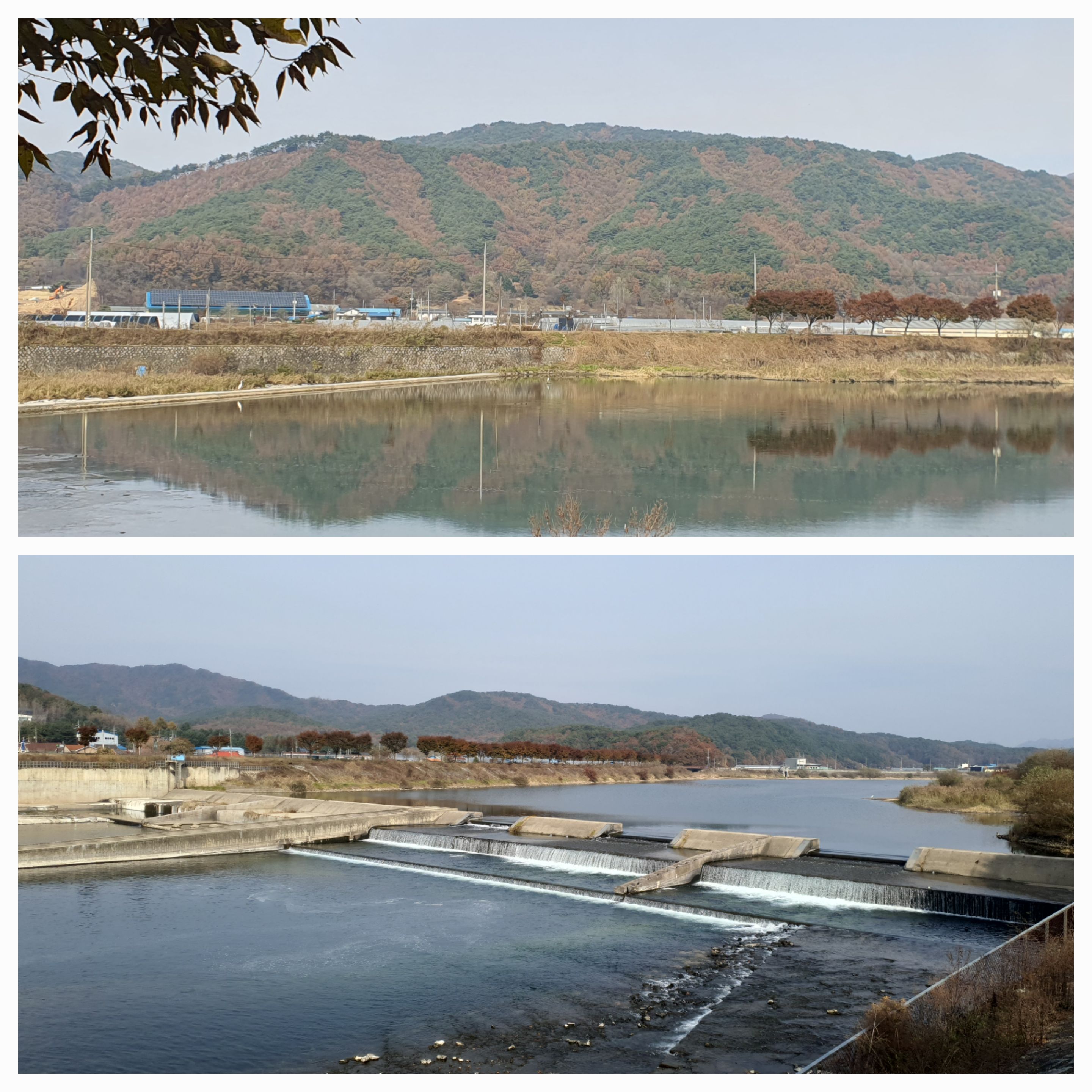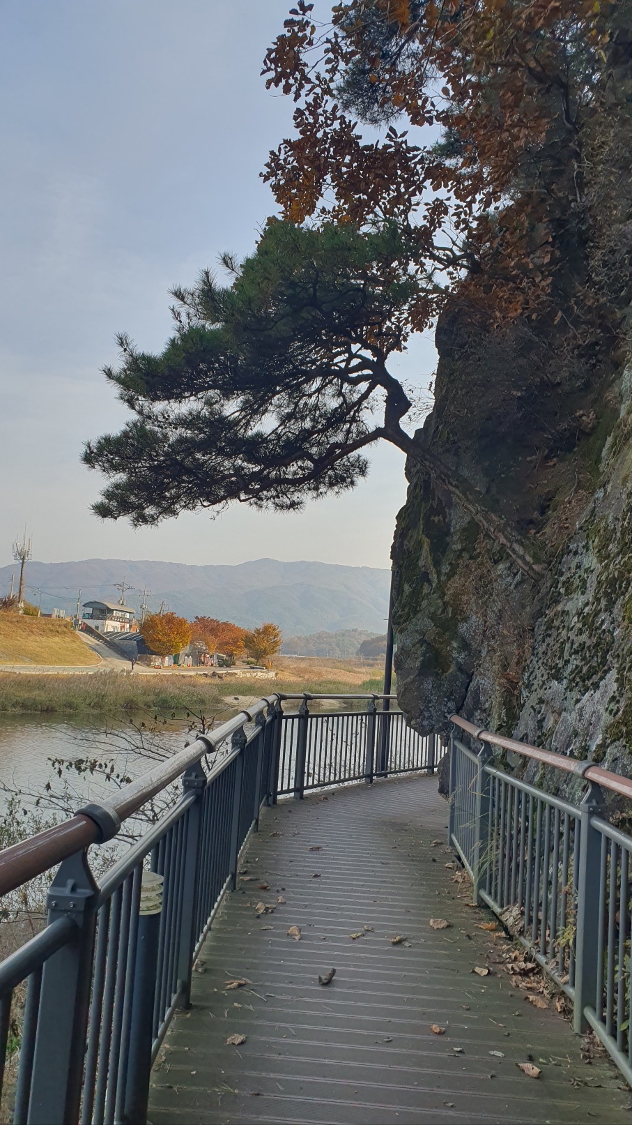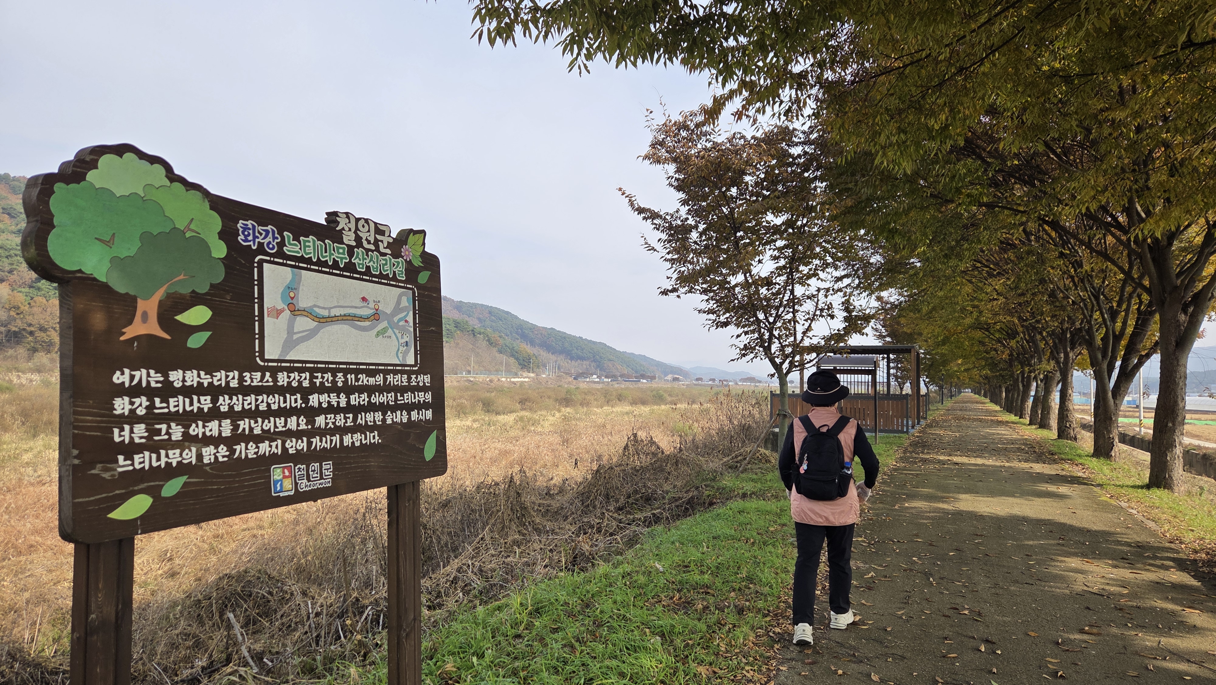 장수대교와 청양 3리 수변공원을 지나 느티나무 단풍을 즐기며 화양 강변을 거닌다.