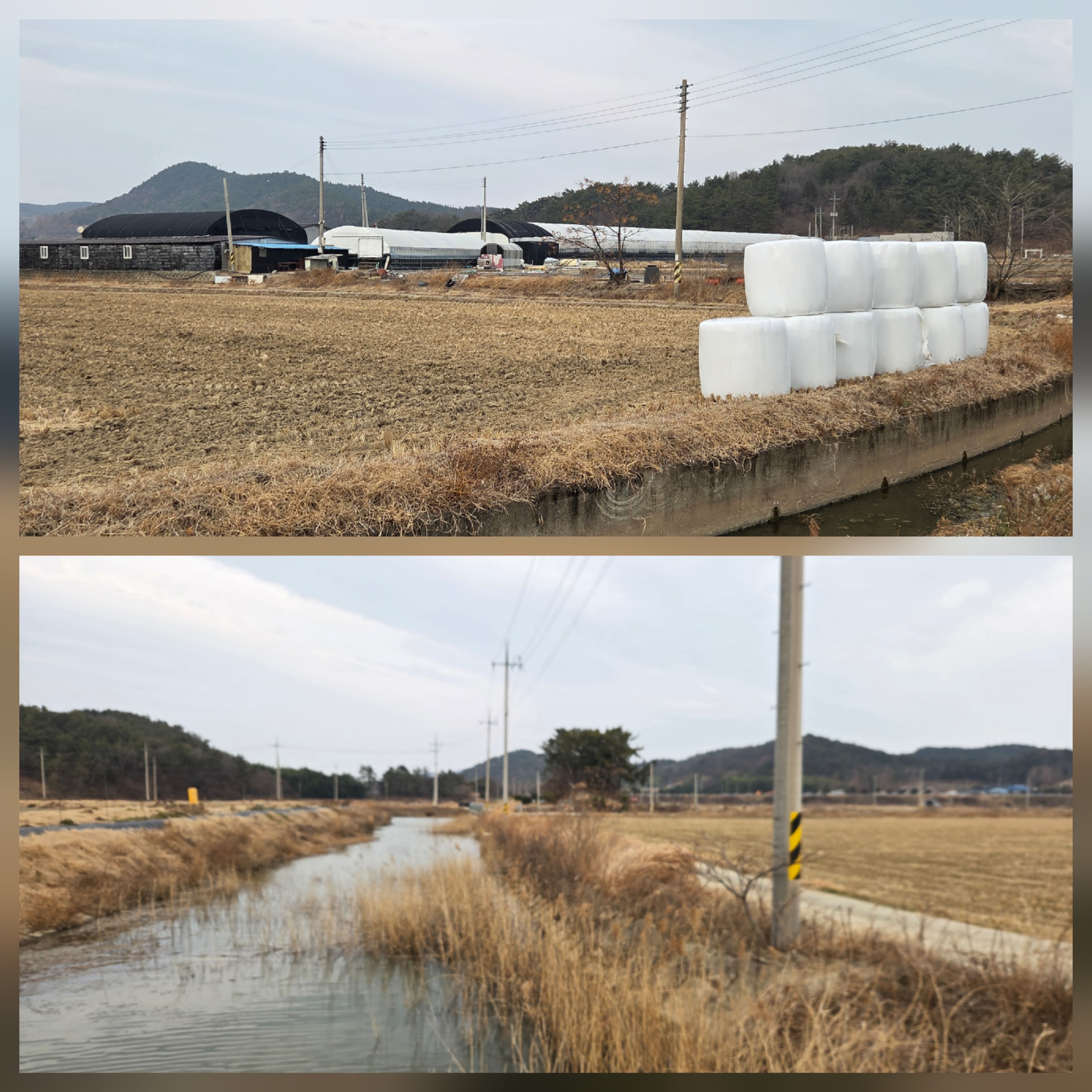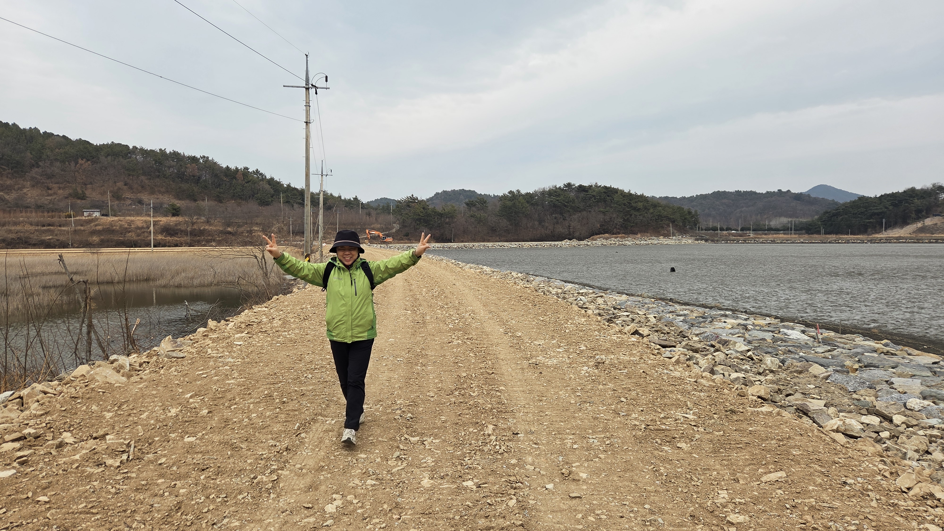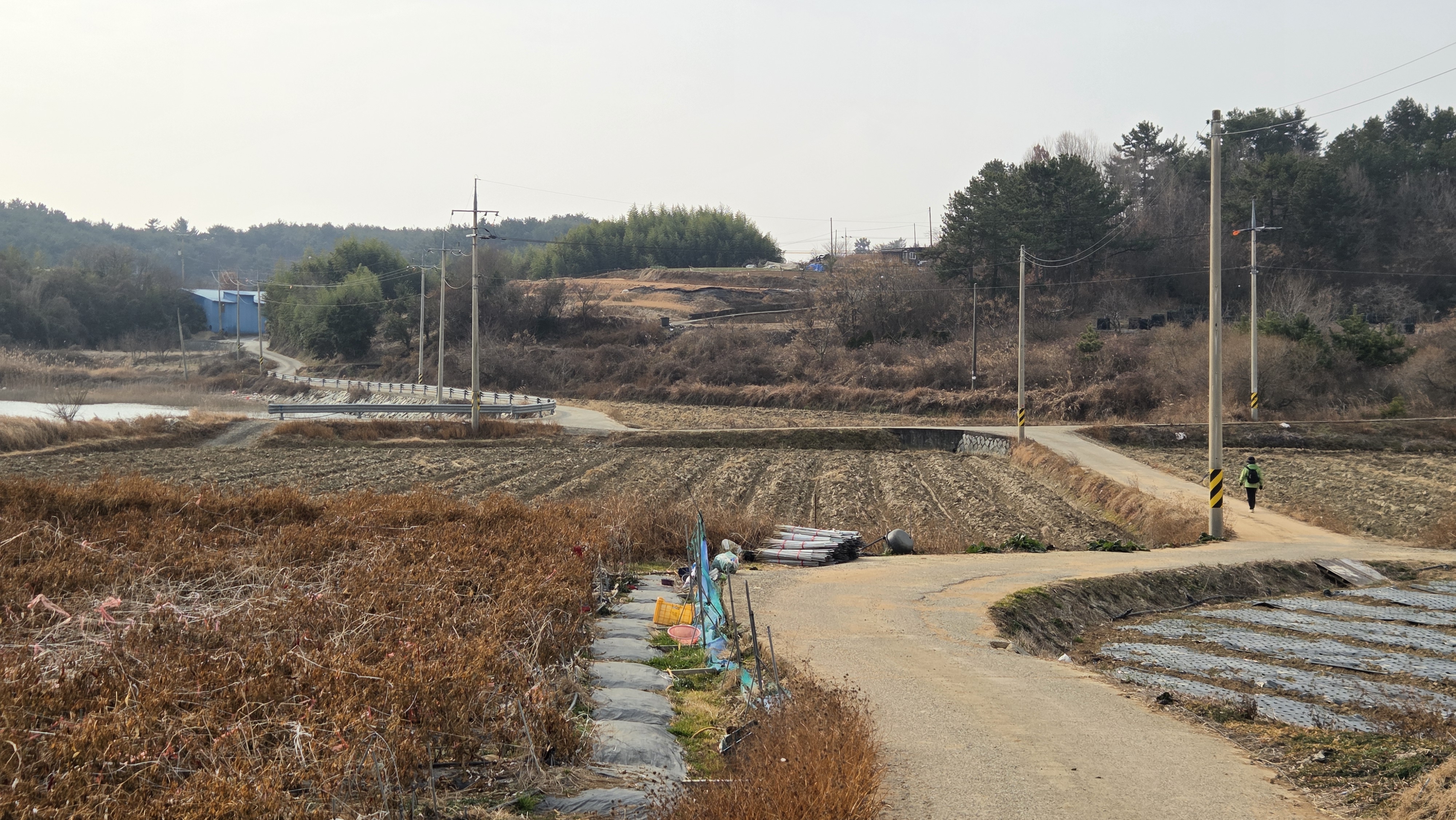 바닷가 방조제 공사장을 지나 우사 옆을 지난다.