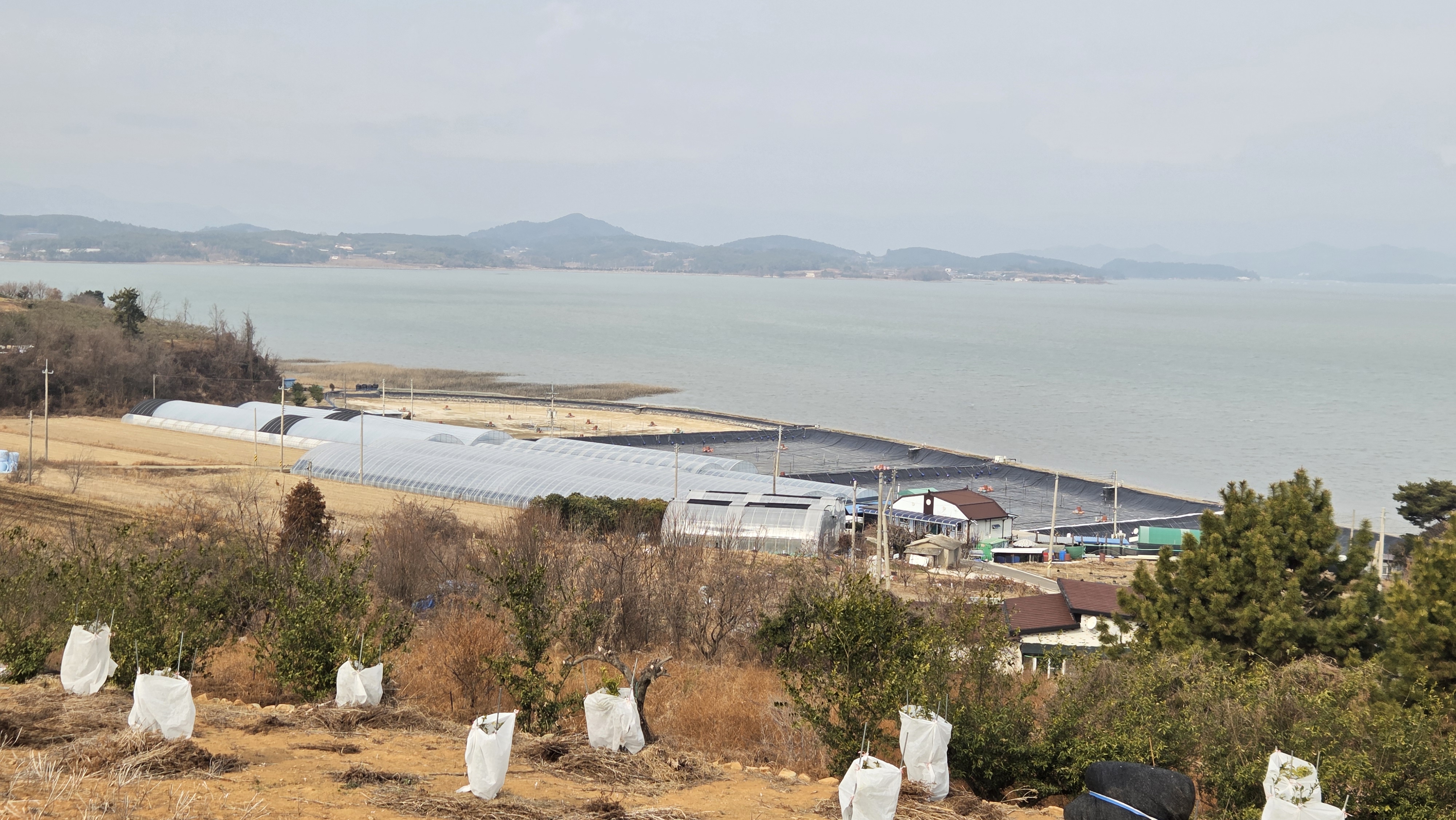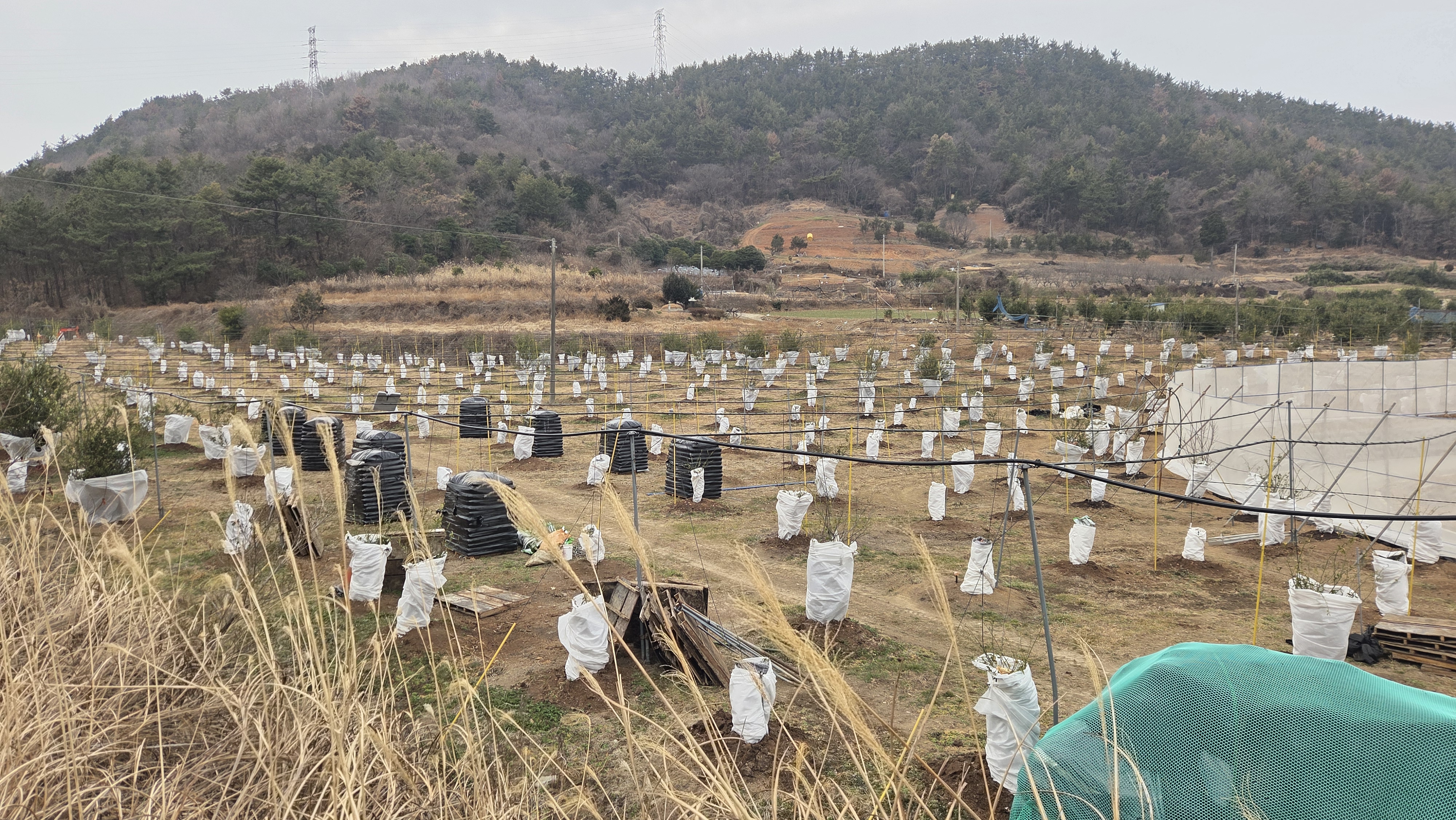 귤나무 묘목이 찬 바람을 이겨낼 수 있도록 바람막이를 해주었다.