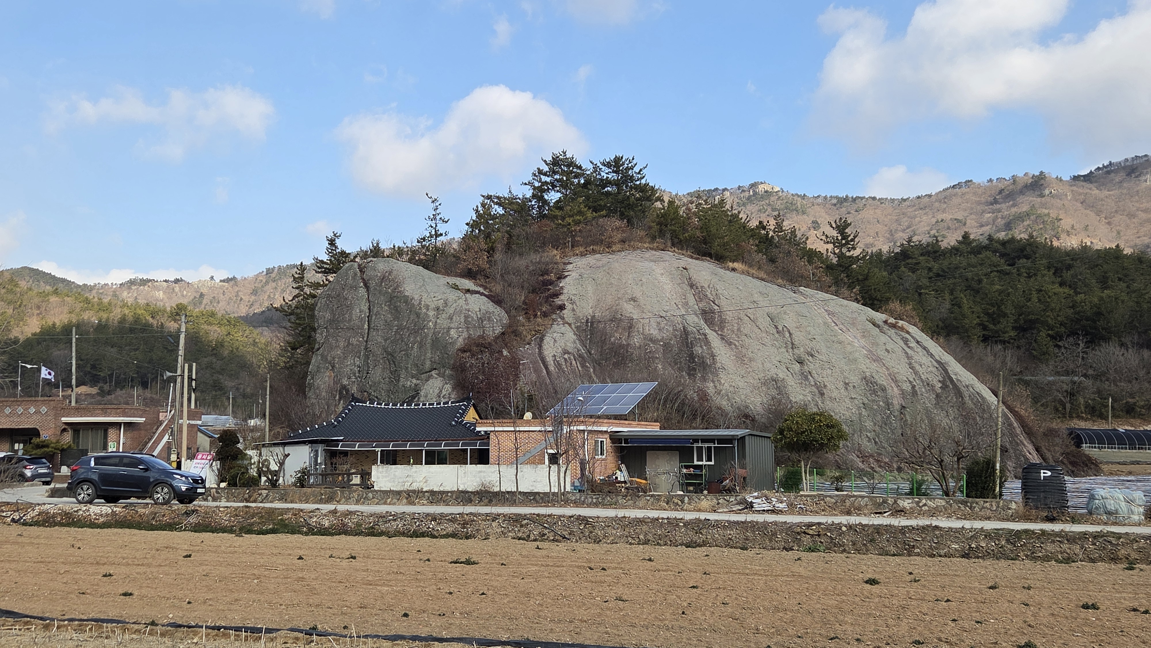 객산리 마을회관 옆의 큰 바위가 마을을 지켜주는 듯 하다.