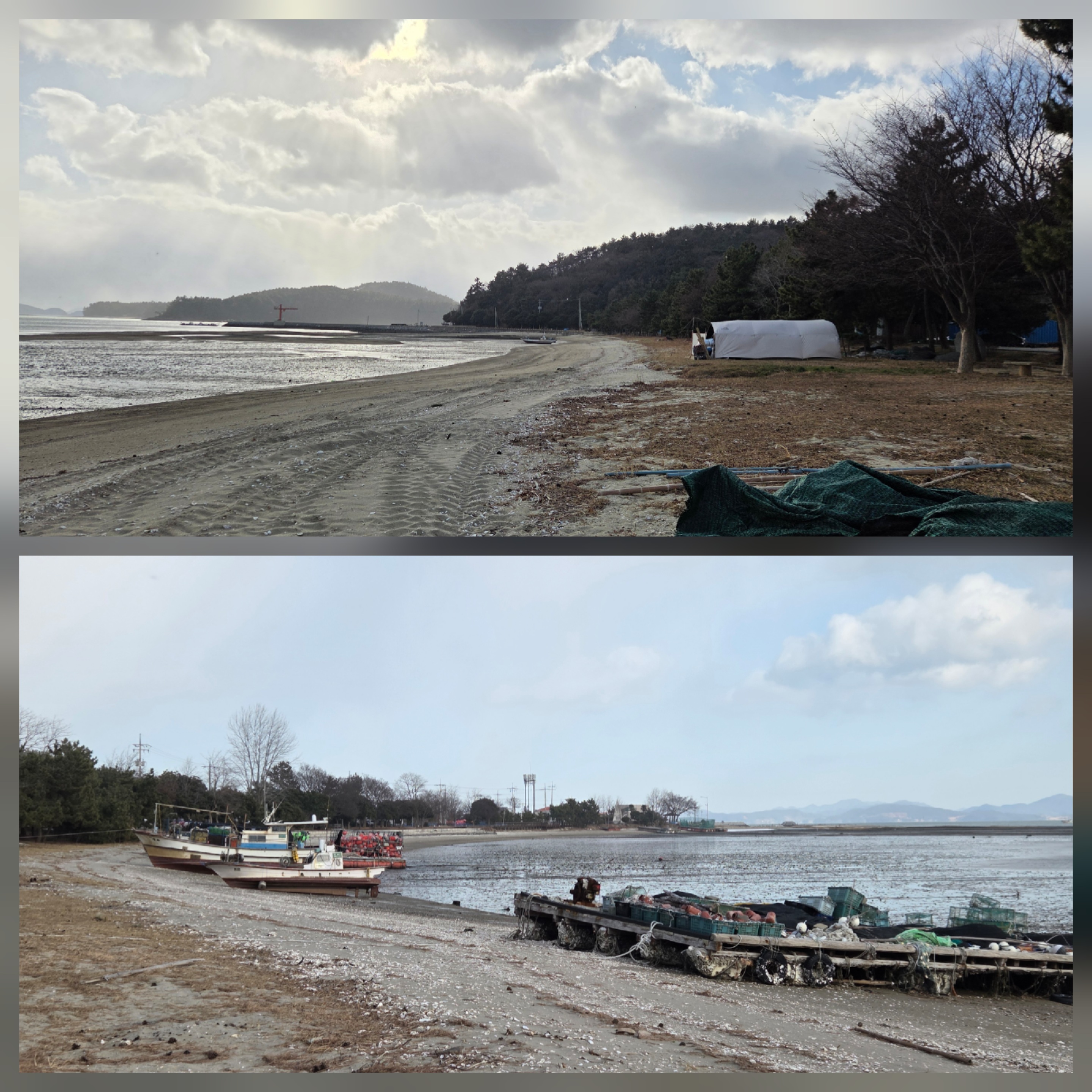 장군쟁이휴게소 해수욕장에 겨울캠핑을 즐기는 사람들이 있다. 이 추운 겨울 바닷가에서 망중한을 누리는 이들이 존경스럽다. 파란 하늘을 배경으로 큰 생선을 햇빛에 말리는 모습이 정겨운 모습으로 다가온다.