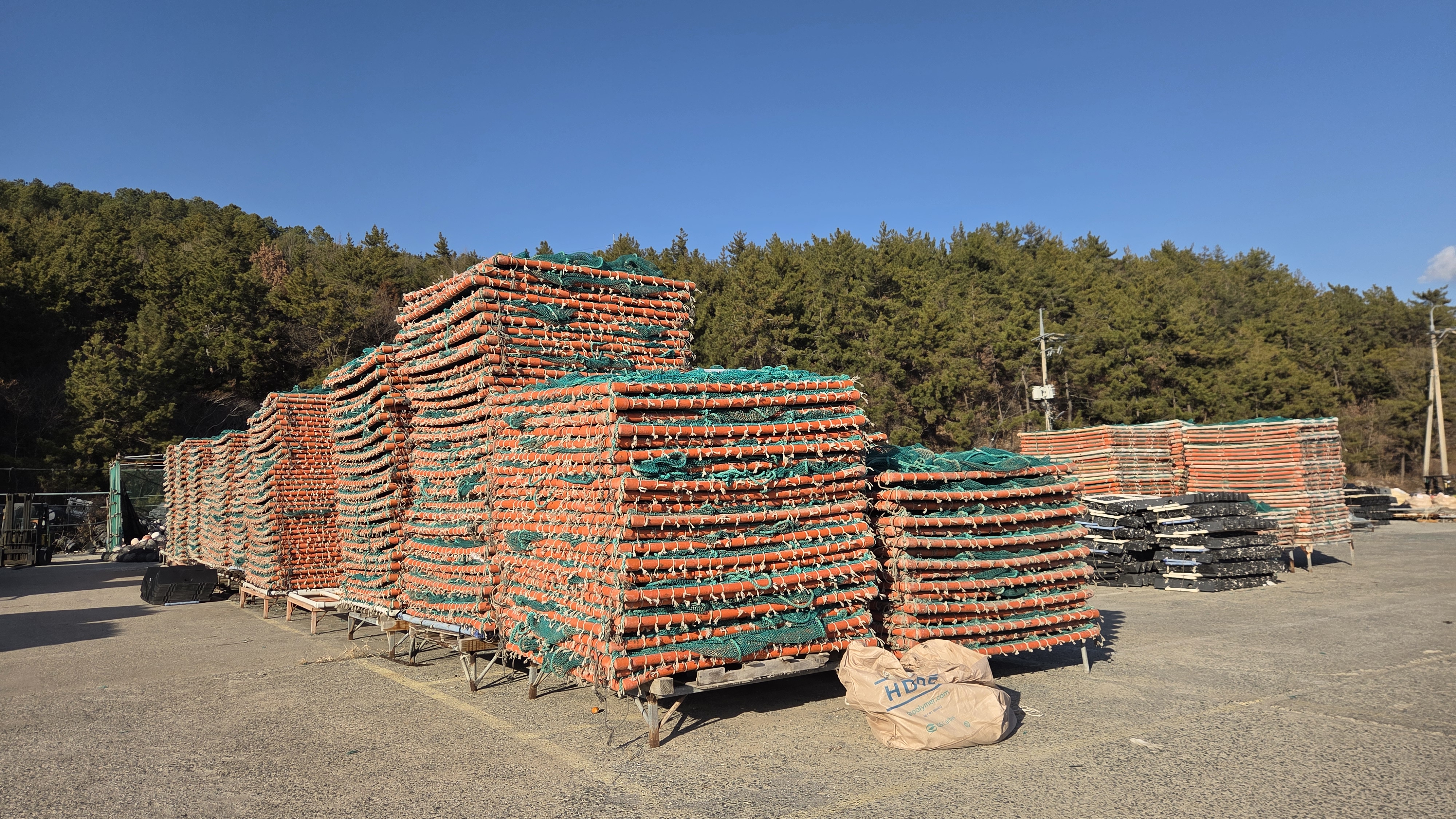 신마마을회관을 지나 마량항쪽으로 나아간다. 양식장에서 사용하는 어구들이 많이 쌓여있다.
