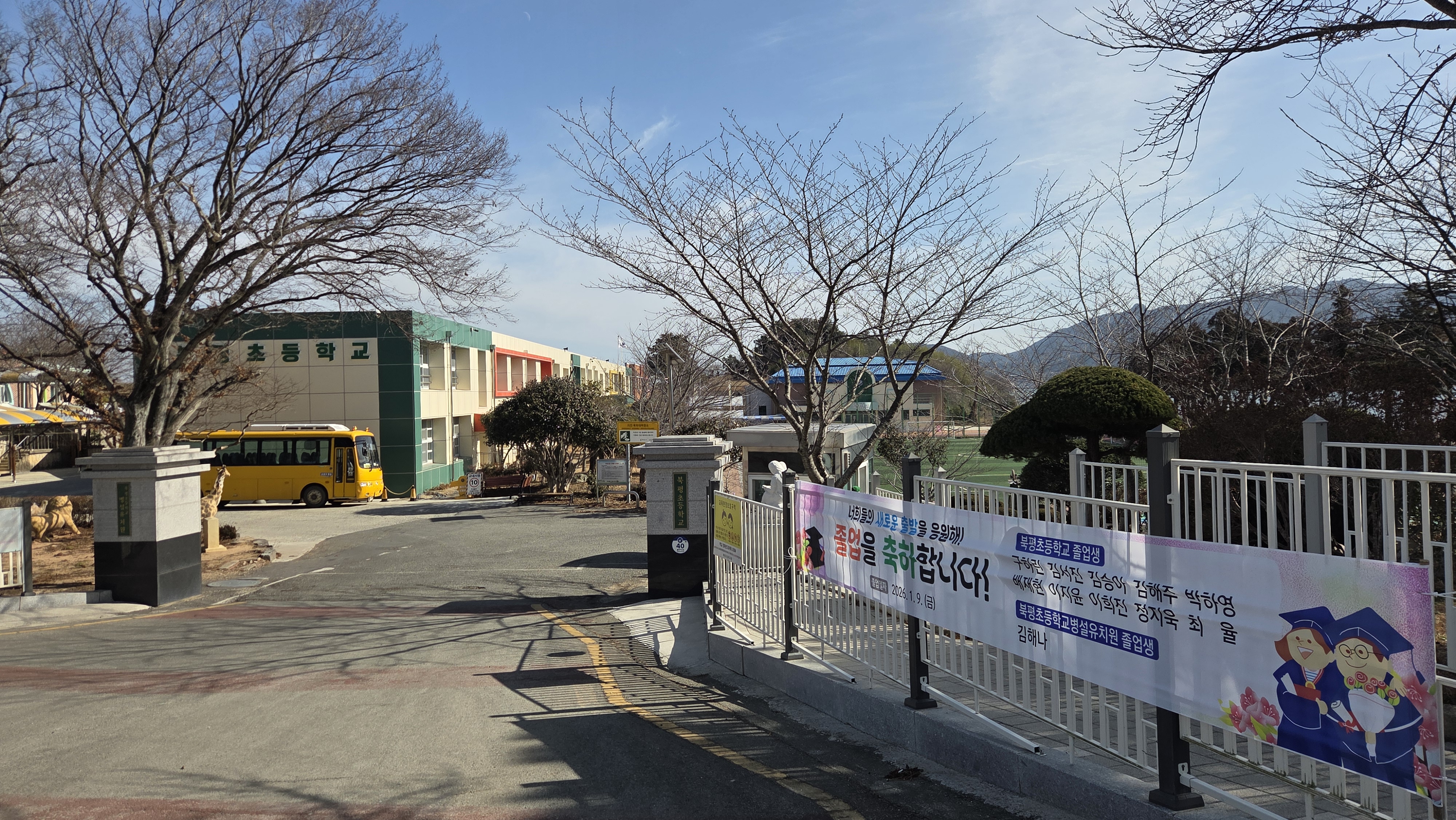 북평초등학교 앞을 지난다. 정문에 게시된 현수막에 금년 졸업생 8명의 이름이 적혀있다. 졸업생 수가 적음에 놀랐고, 요사이 같이 개인정보보호시대에 학생들의 이름이 그대로 노출되었다는 것에 새삼 놀랐다.